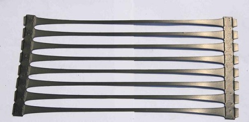 单向拉伸塑料土工格栅,是由高分子聚合物经挤出,然后再纵向拉伸而成,这样形成的具有整体性且分布均匀的椭圆形网结构,具有相当高的拉伸强度和拉伸模量,这种结构的土工格栅给土壤提供了理想的连锁系统,该产品拉伸强度大(>150Mpa)适于各型土壤及各项性能指标都优于未经拉伸的土工网,是目前一种理想的加筋加固材料。